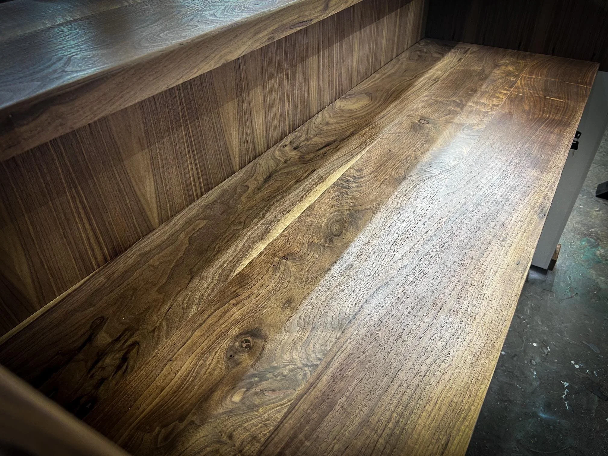 The pictured desk is a combination of solid walnut, quartered premium walnut veneer, and a white diamond epoxy. The final result is a stunning desk that measures 30" deep x 42" tall x 72" long.