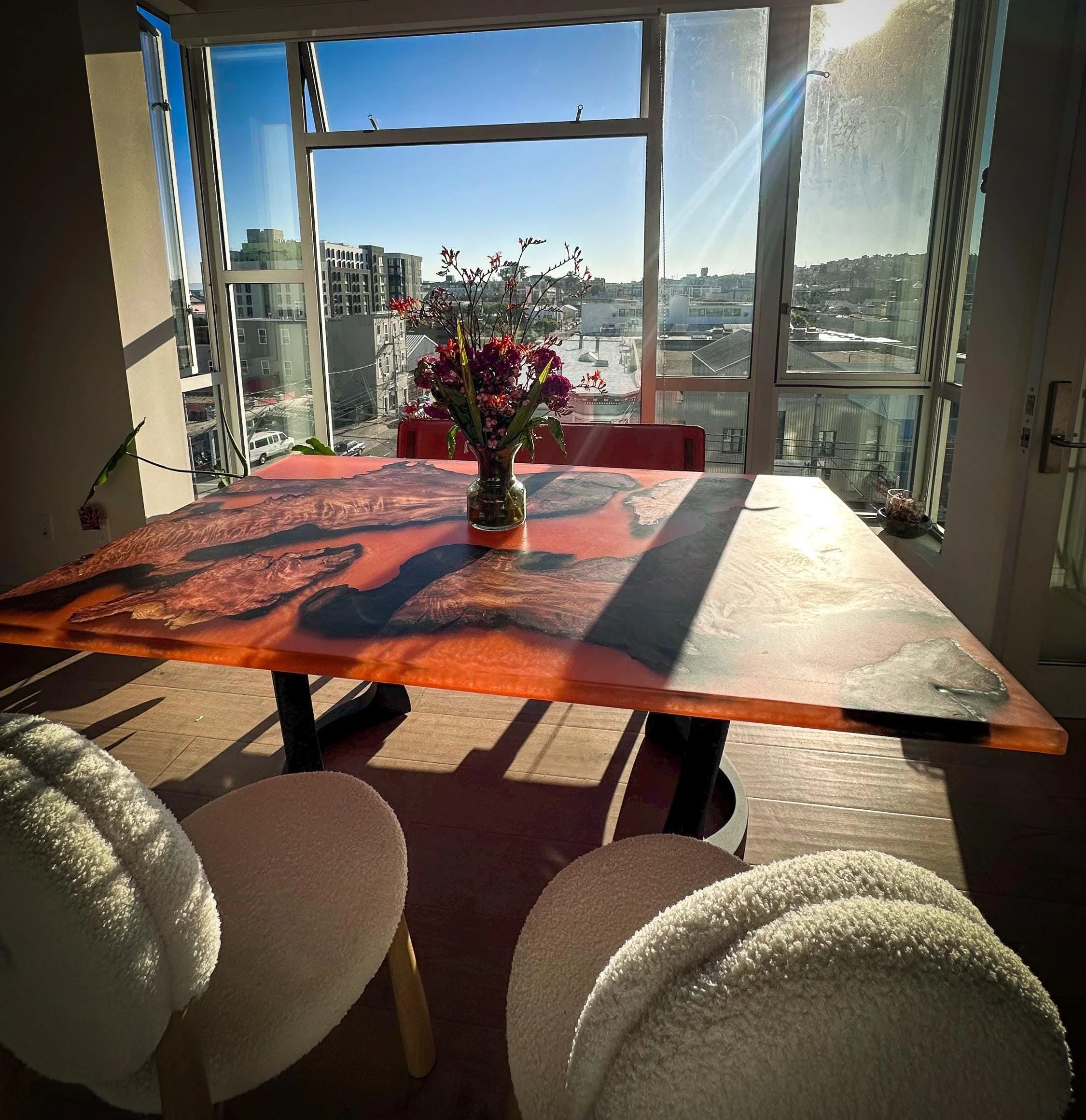 This custom redwood dining table is a one-of-a-kind statement piece, handcrafted to order using solid, sustainably sourced redwood slabs and premium epoxy resin. Designed to be both functional and striking, each table showcases dramatic live edges, rich grain patterns, and a smooth, glass-like finish that elevates any dining space.