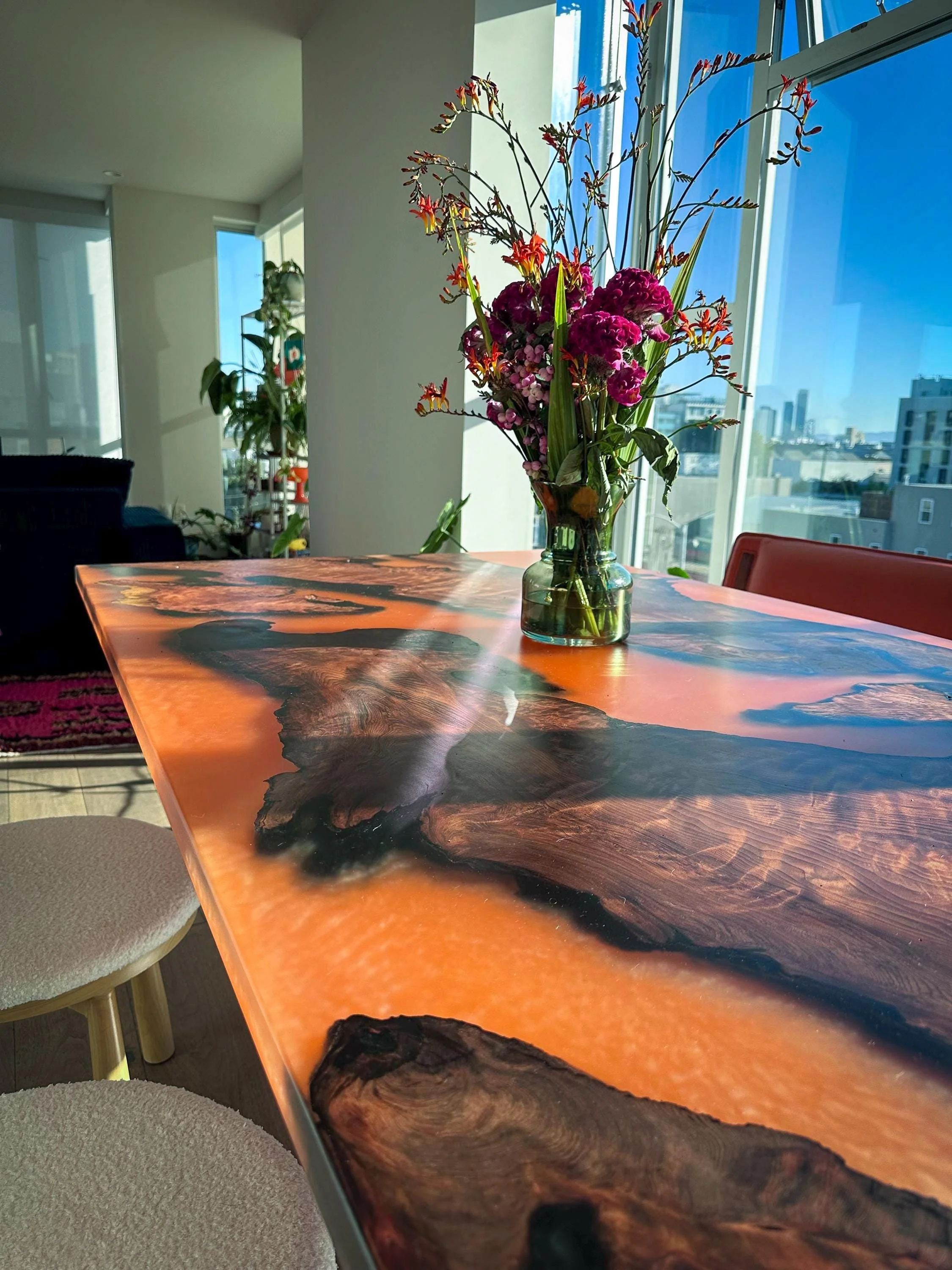 • Solid redwood slabs • Warm "vivid orange" epoxy river • Live edge profile • Smooth satin finish