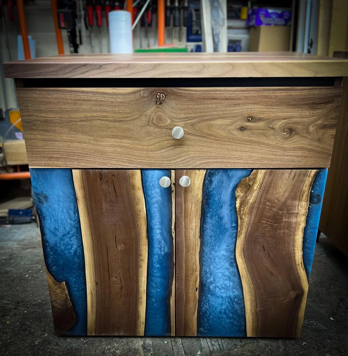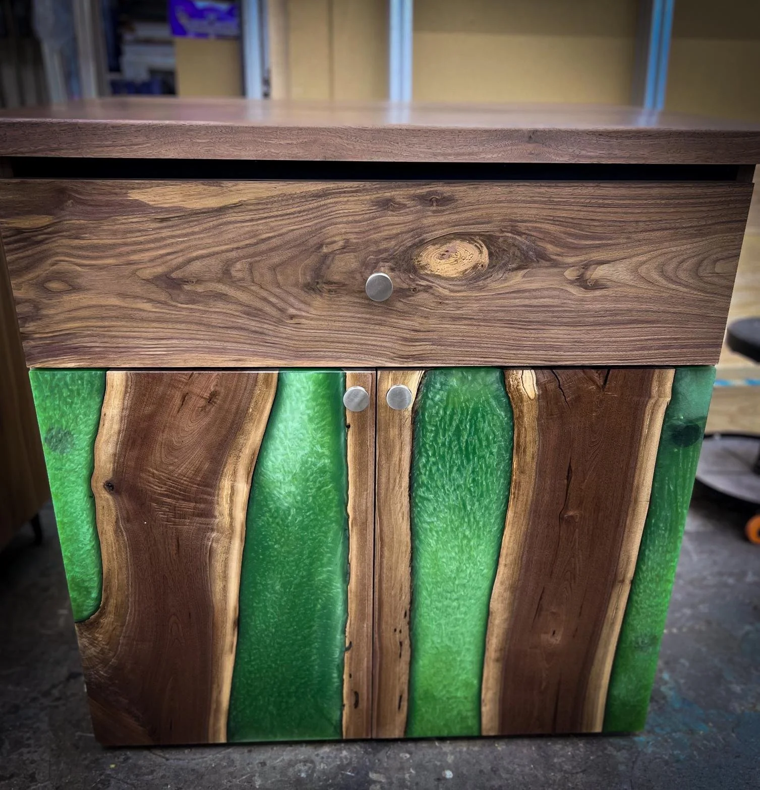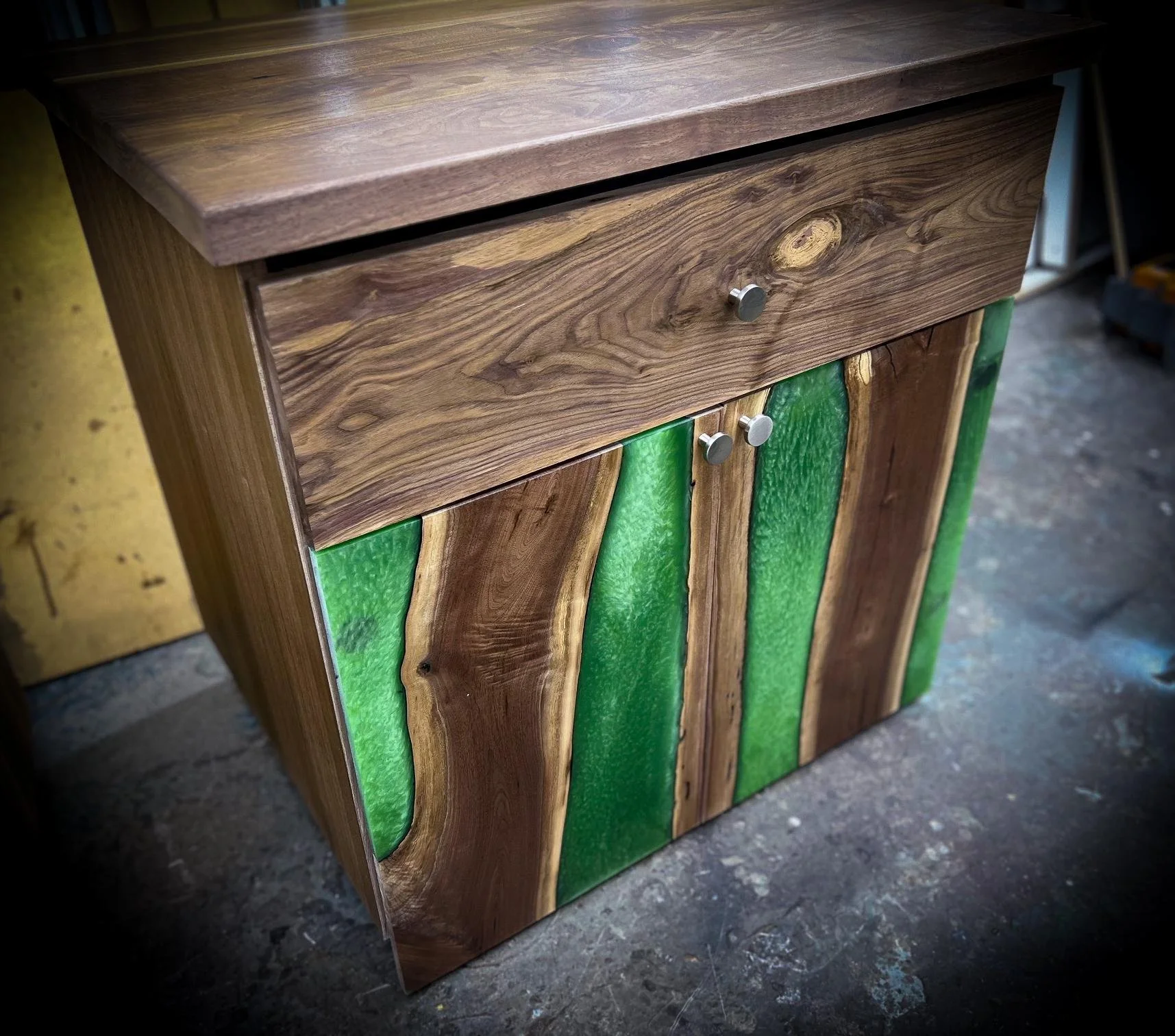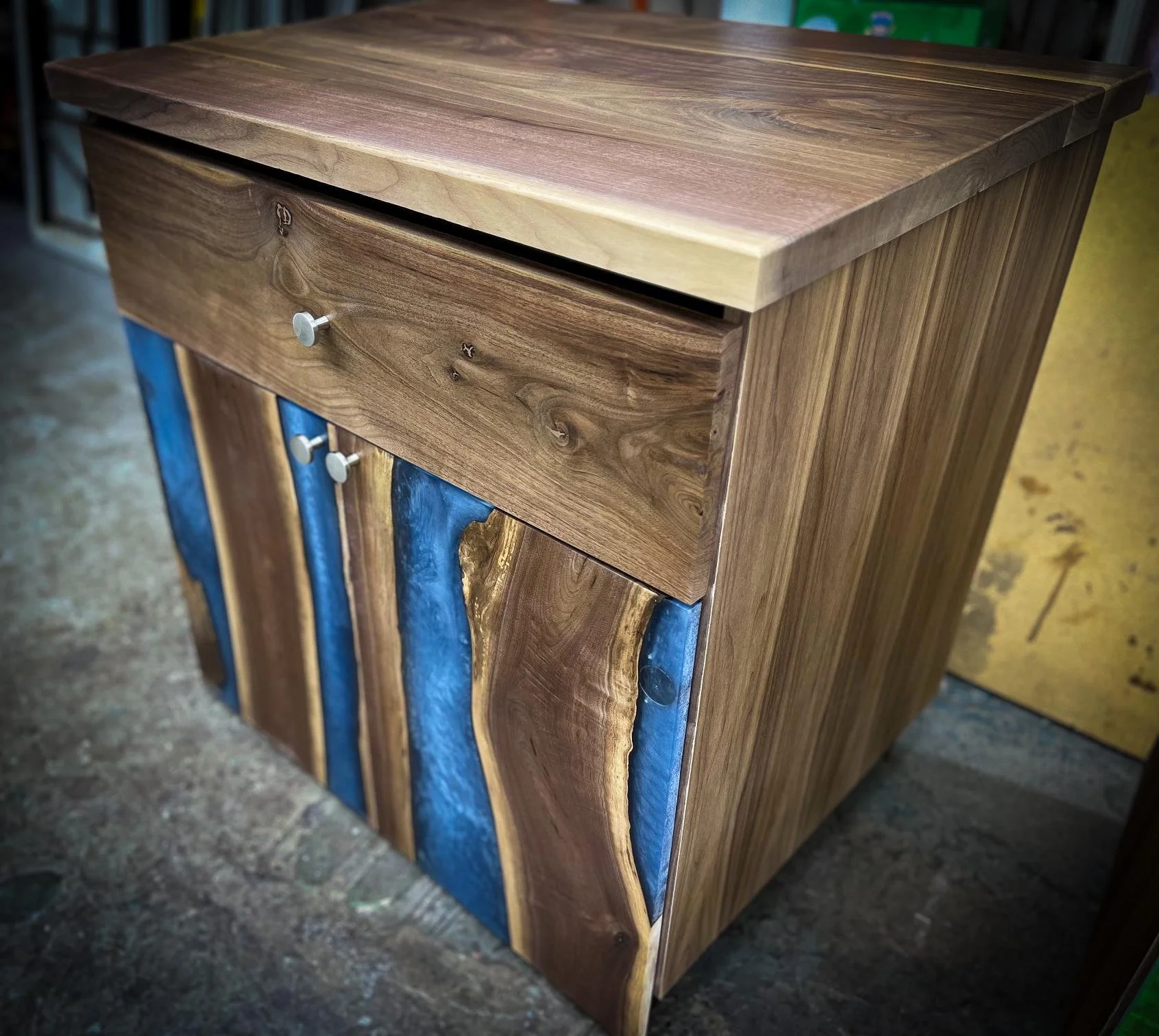 Transform your bathroom’s aesthetic with our handcrafted walnut bathroom vanity, designed to blend luxury and functionality. Featuring epoxy resin doors with a mesmerizing design and a solid walnut countertop, this vanity is a statement piece that exudes warmth and natural beauty.