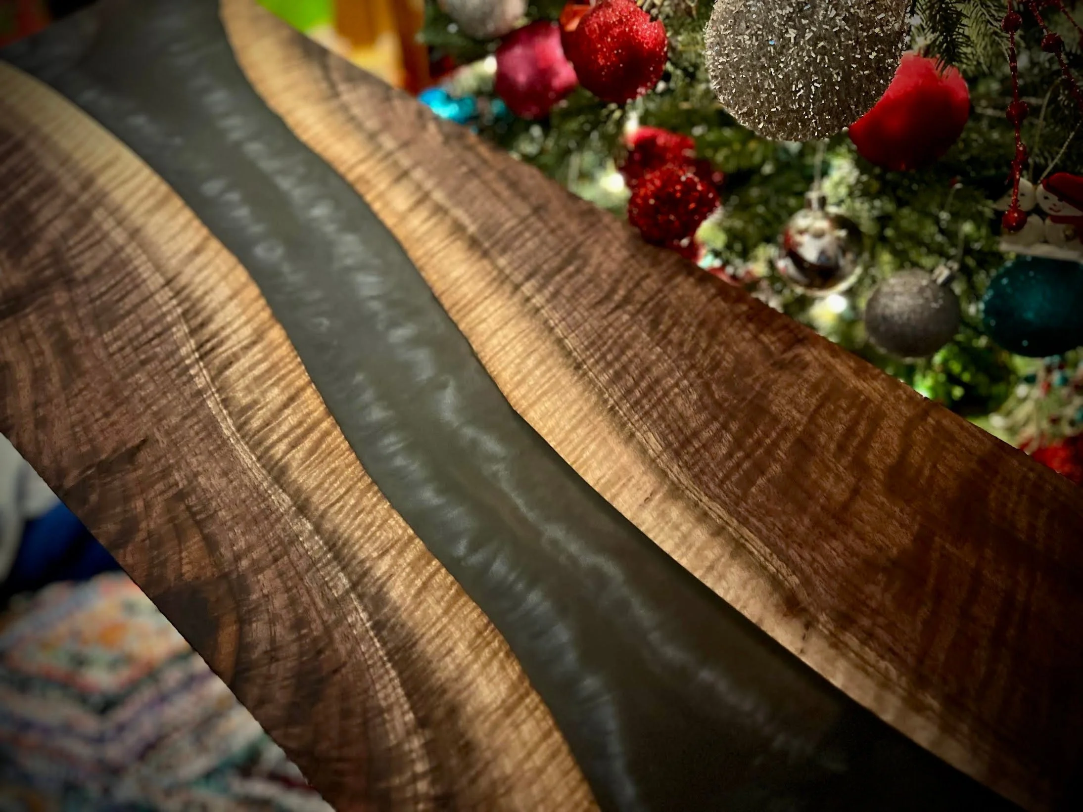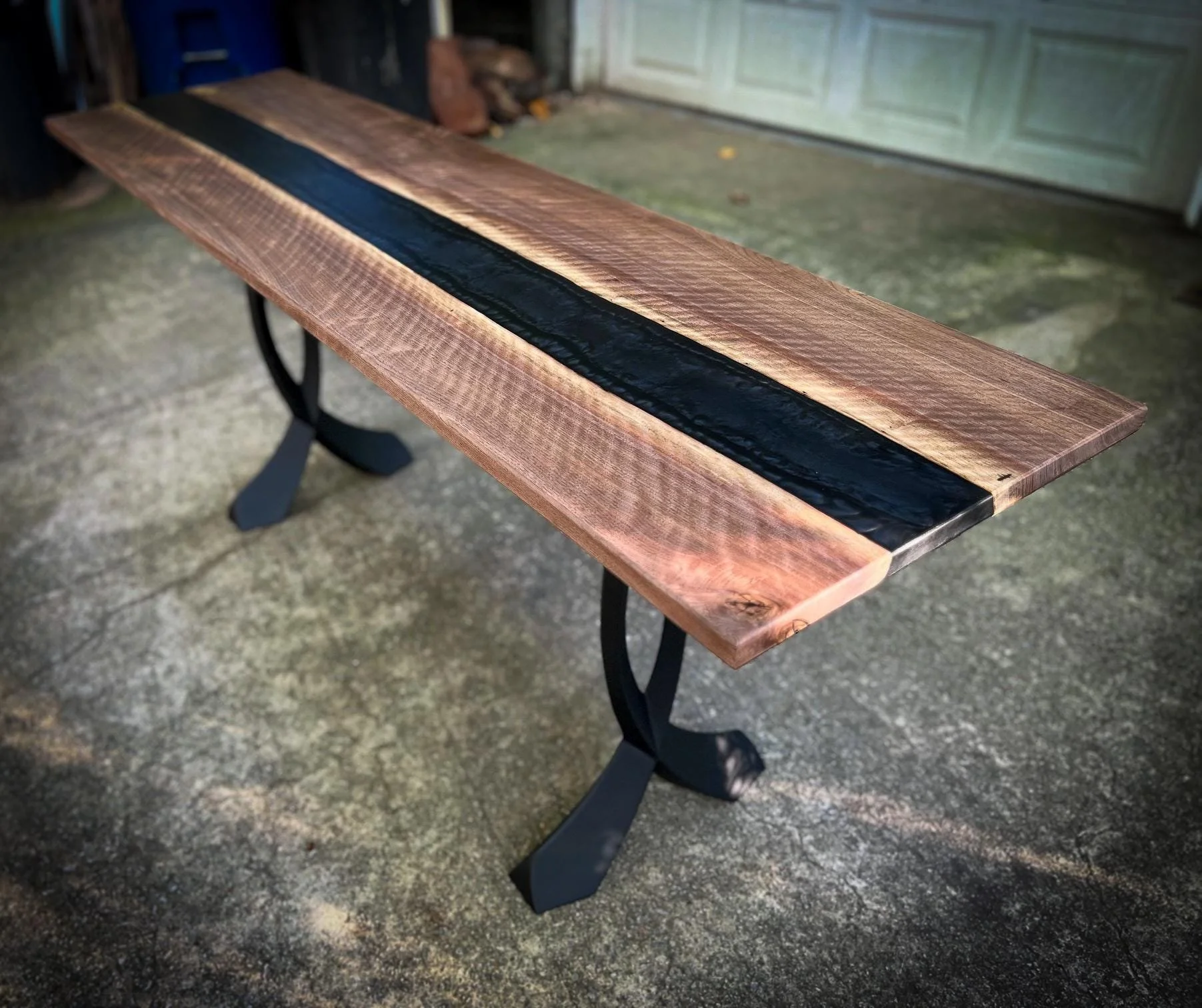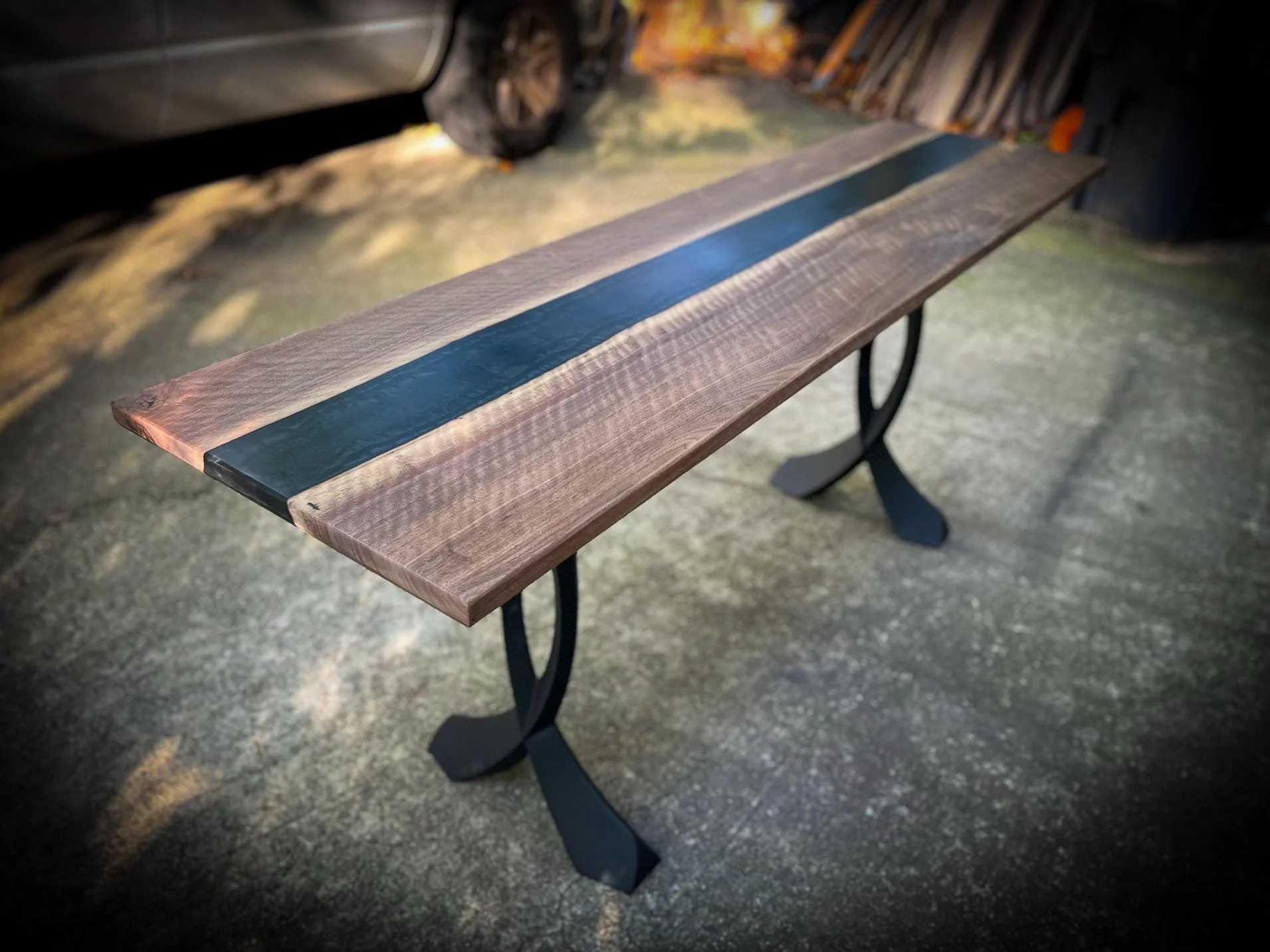 We craft this entry table out of locally harvested American Black walnut and work with our clients to select both the slab and the resin color for their entry tables. The base and support are made of hard maple and stained/painted per the customer's request.