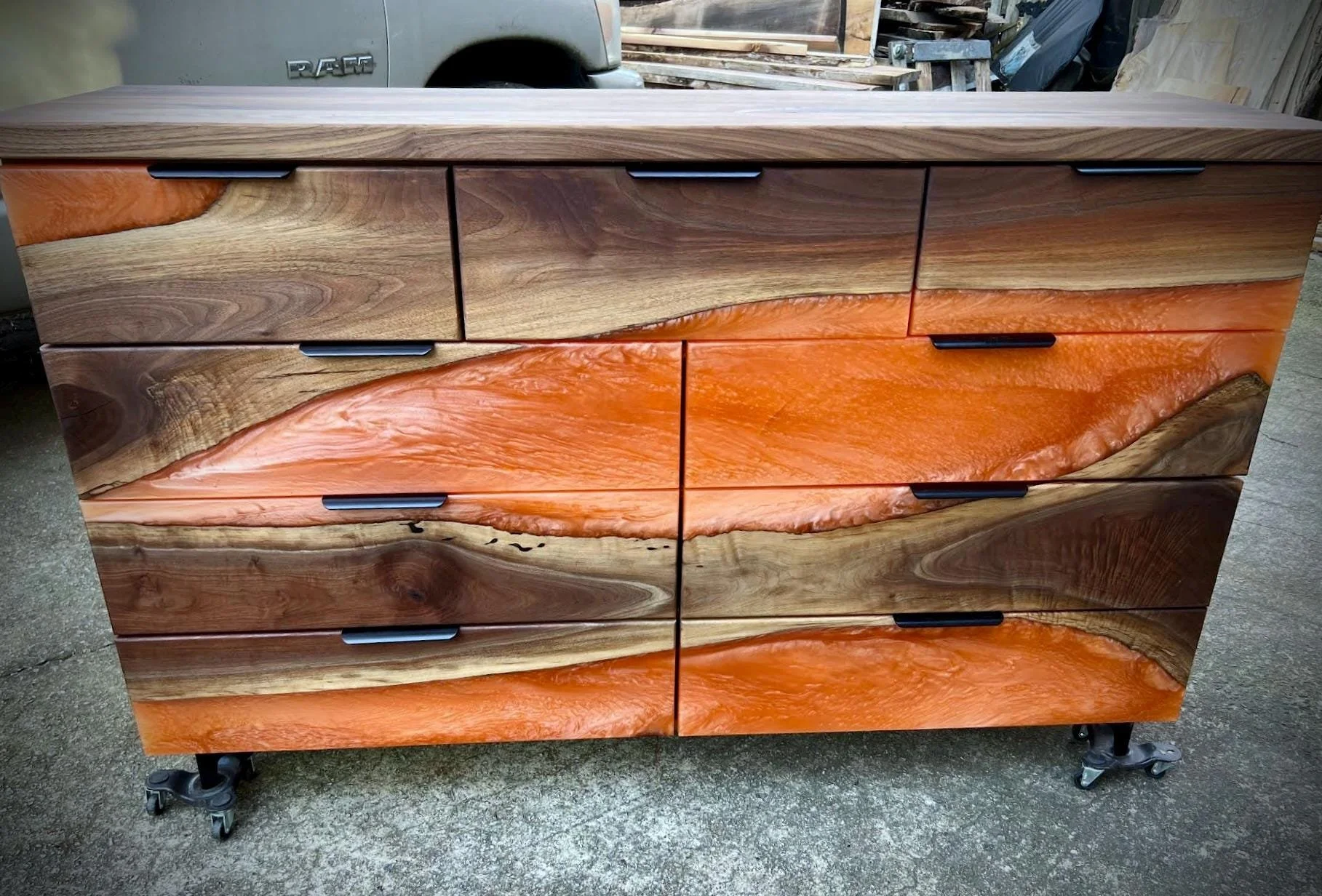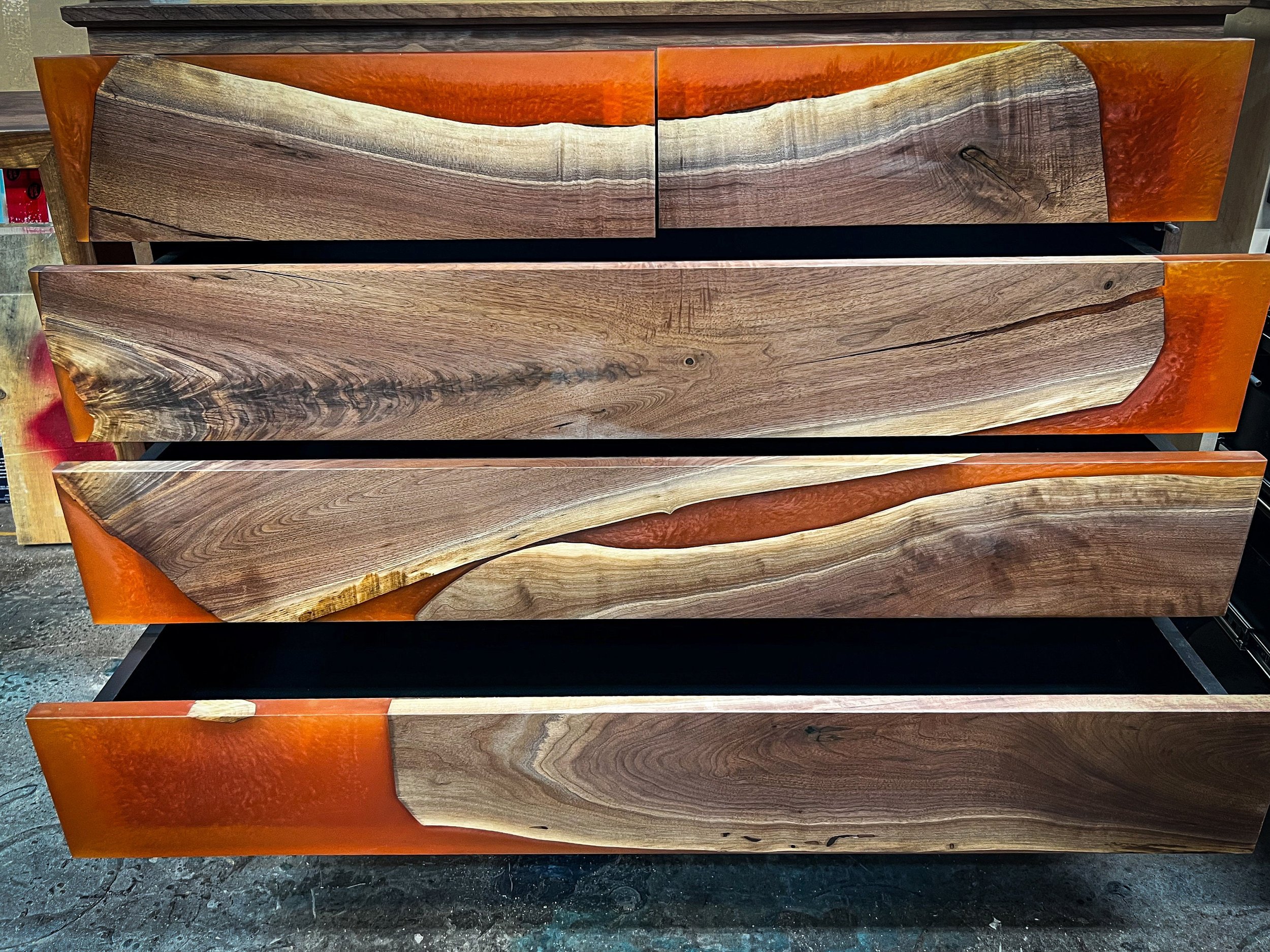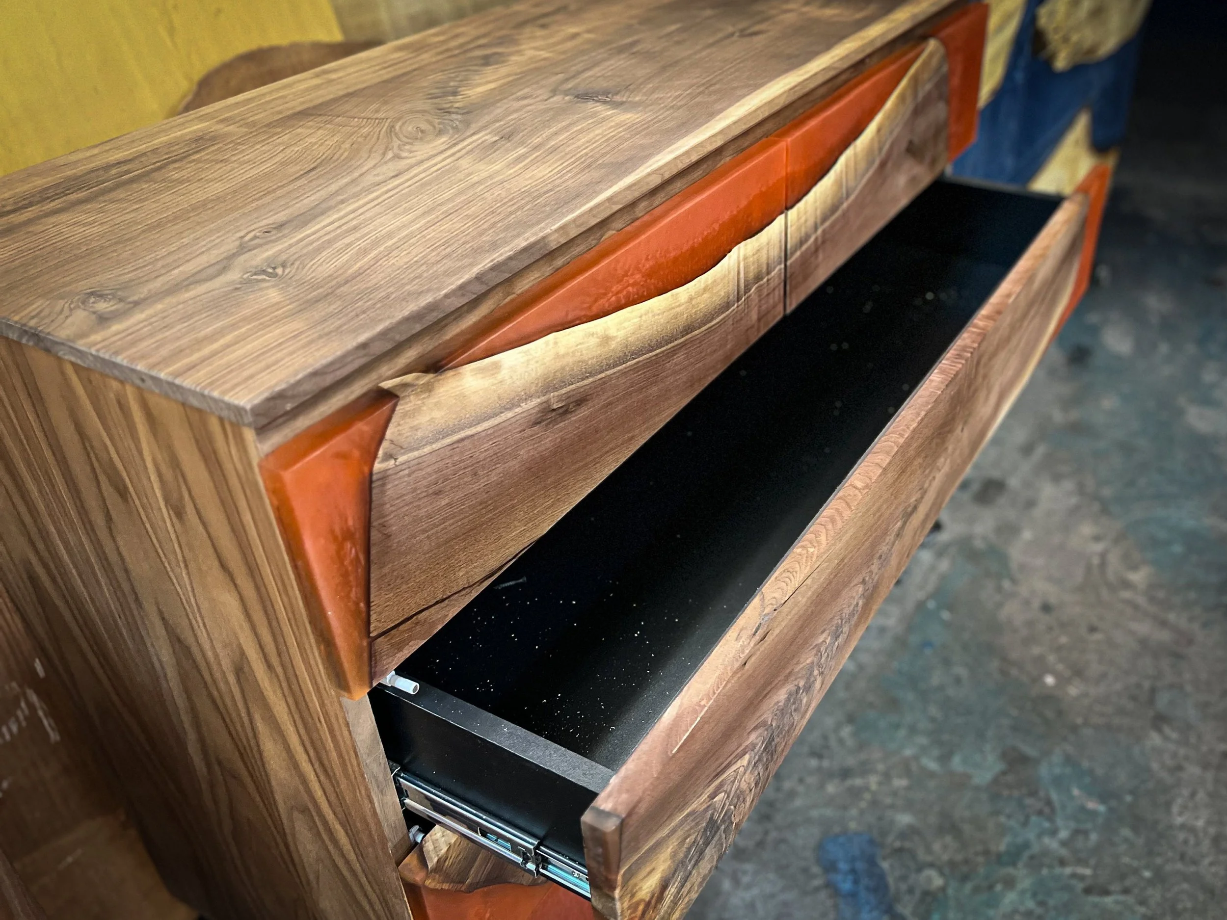 The drawer faces are the real showstopper, though. Each drawer front is made from a single slab of wood that we pour in one form and then cut down so that each piece has a continual flow. The final product is an eye-popping centerpiece for any room.