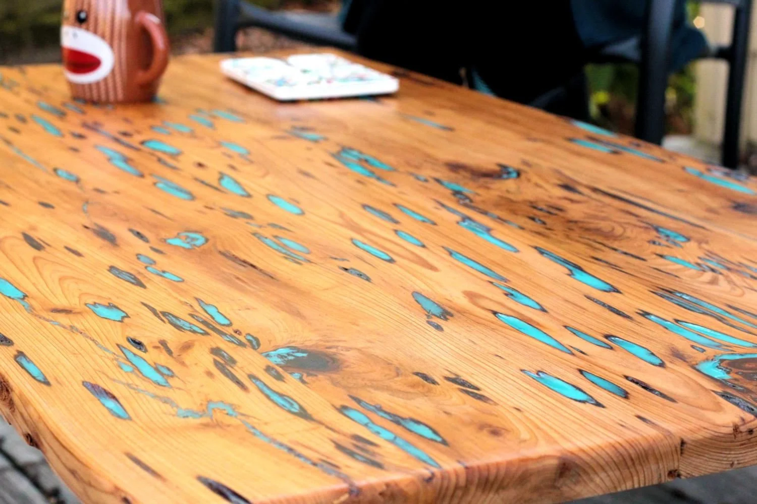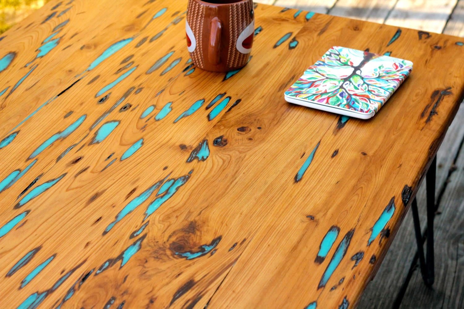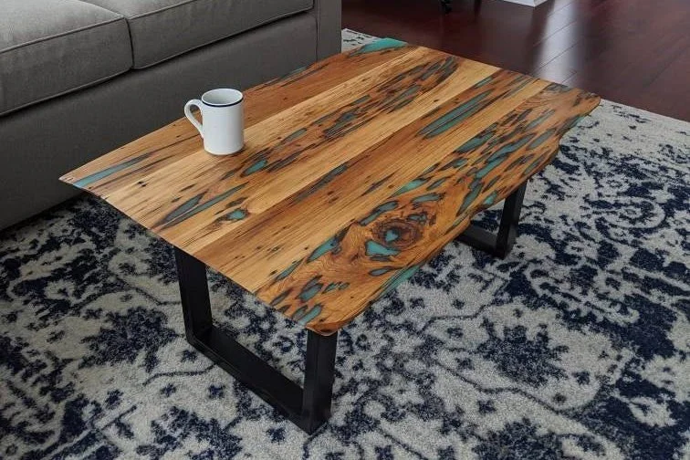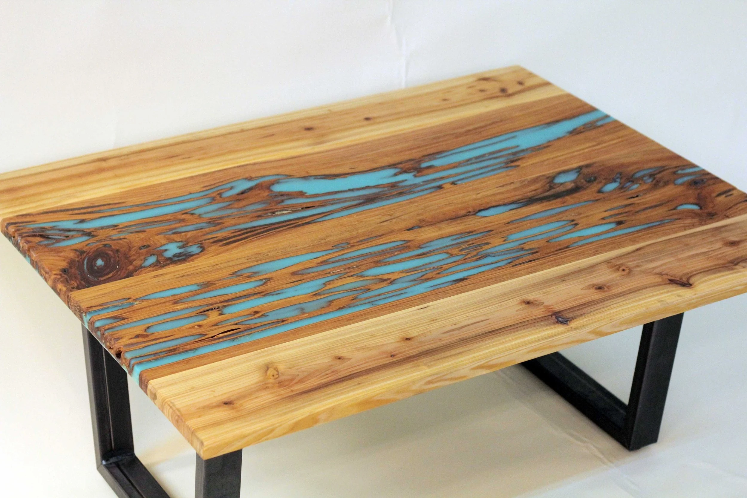 For sale is an eclectic, one-of-a-kind glow coffee table that is sure to be the talk of any event you host! This handcrafted table is fabricated out of unique pecky cypress: a species renowned for its "pockets" that are riddled throughout the wood. We carefully clean out these pockets and fill them with a colored epoxy / resin mixture that not only pops during the day but will glow in the dark in the evening!