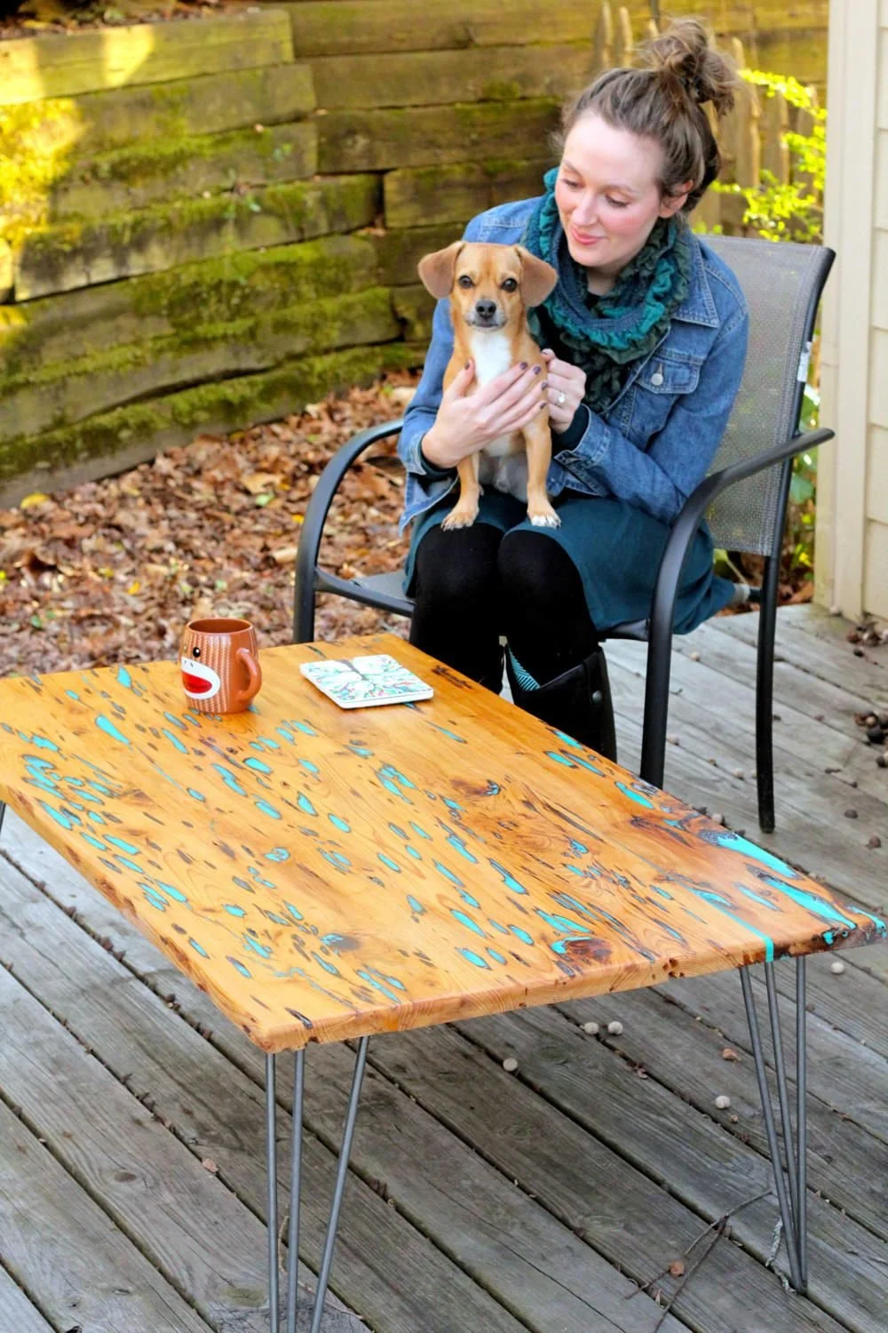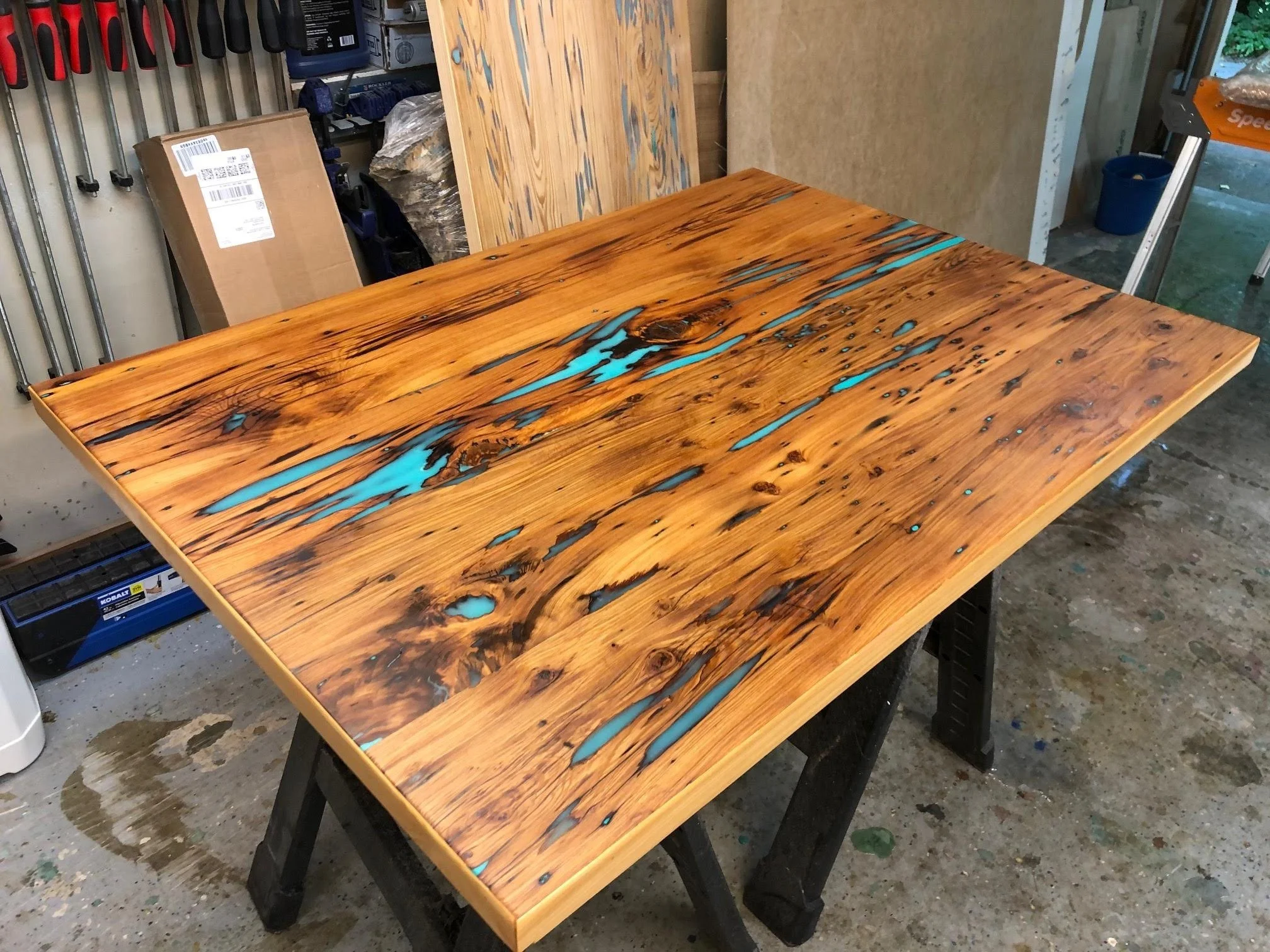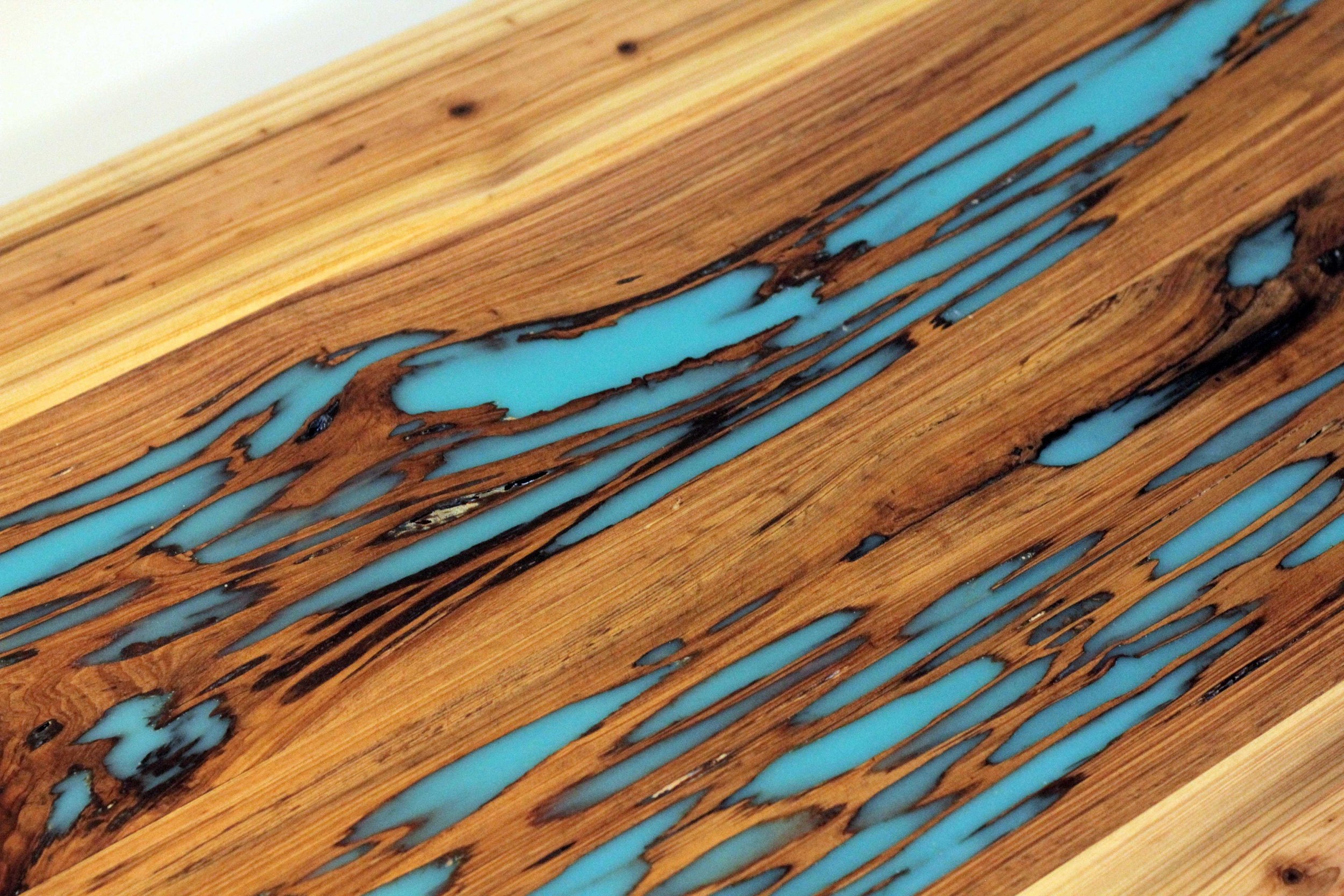 For sale is an eclectic, one-of-a-kind glow coffee table that is sure to be the talk of any event you host! This handcrafted table is fabricated out of unique pecky cypress: a species renowned for its "pockets" that are riddled throughout the wood. We carefully clean out these pockets and fill them with a colored epoxy / resin mixture that not only pops during the day but will glow in the dark in the evening!
