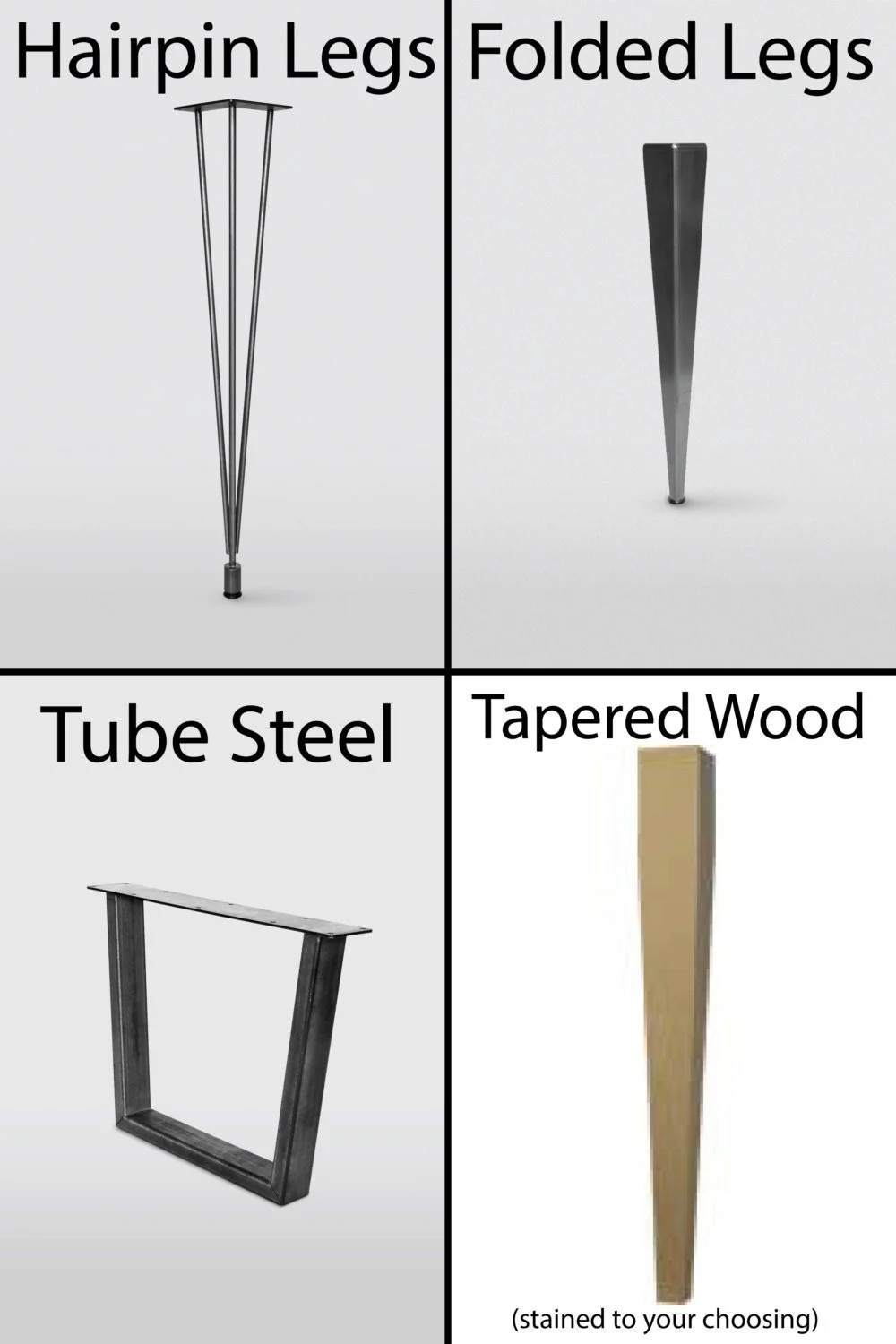 - Choose from several different leg styles that include hairpin, tapered wood, or steel tube.