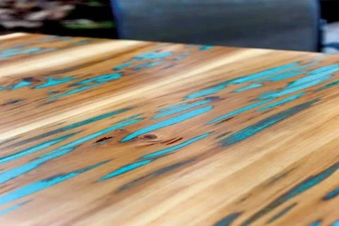 We thoroughly clean out these pockets and fill them with a colored resin that not only contrasts the honey-colored wood but also glows in the dark!