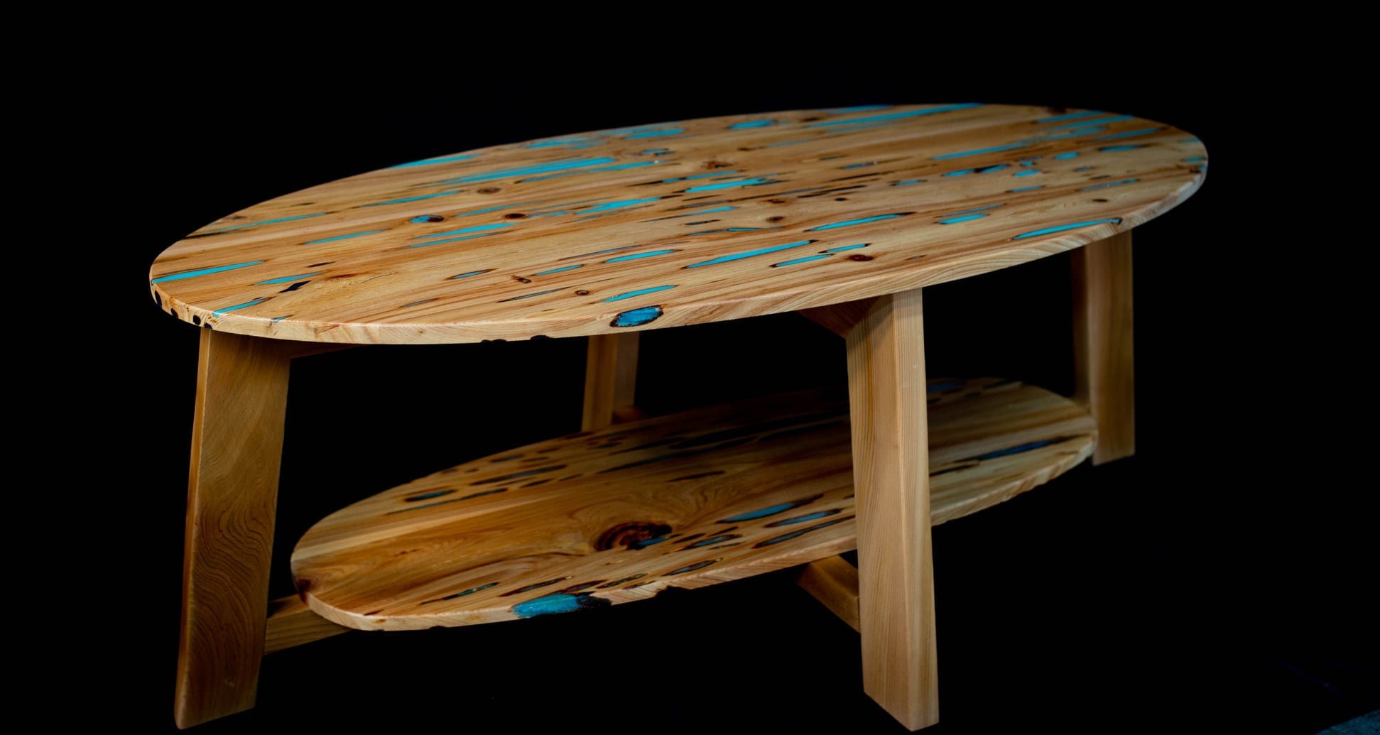 For sale is an eclectic, one-of-a-kind midcentury modern pecky cypress coffee table that is sure to be the talk of any event you host! This handcrafted table is fabricated out of unique pecky cypress: a species renowned for its "pockets" that are riddled throughout the wood. We carefully clean out these pockets and fill them with a colored epoxy / resin mixture that not only pops during the day but will glow in the dark in the evening!