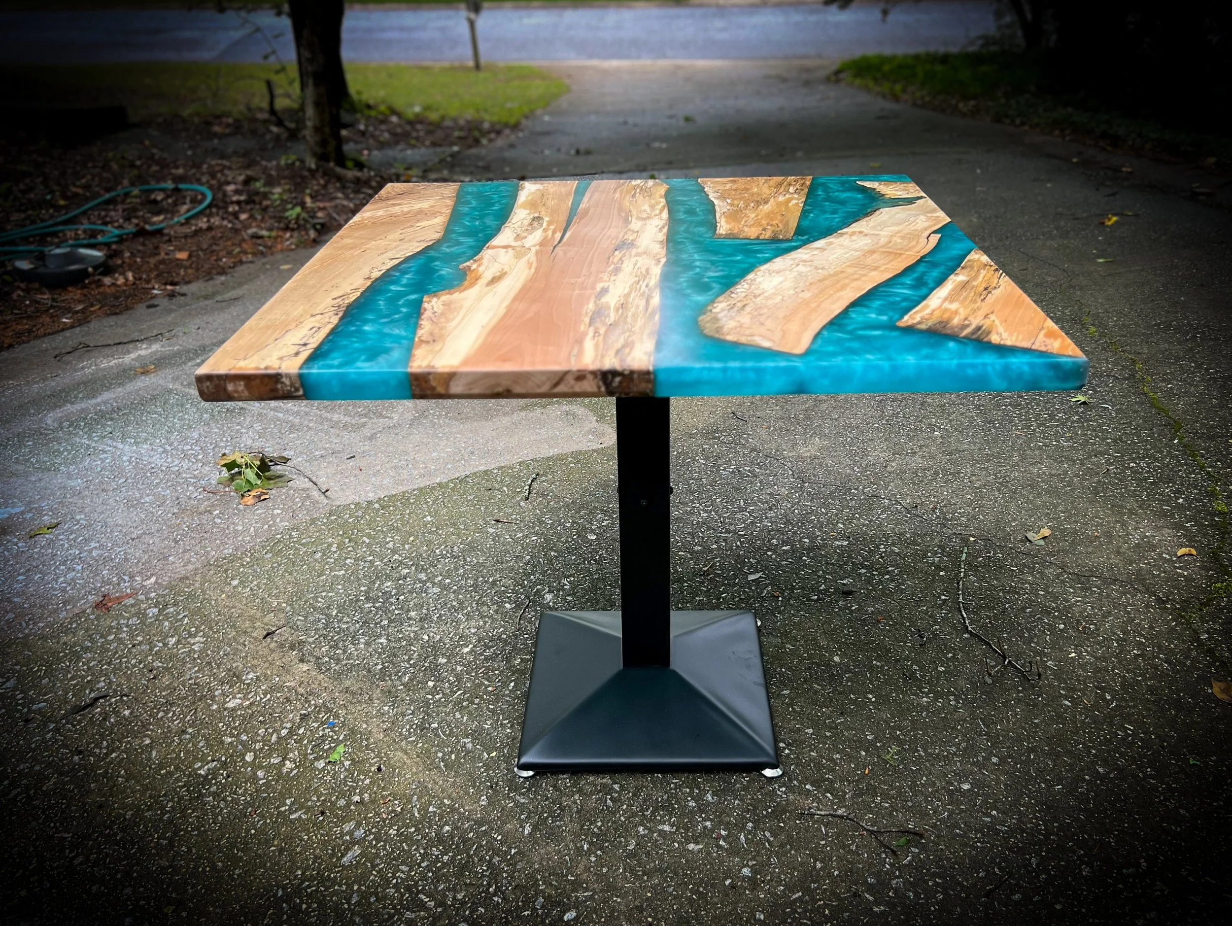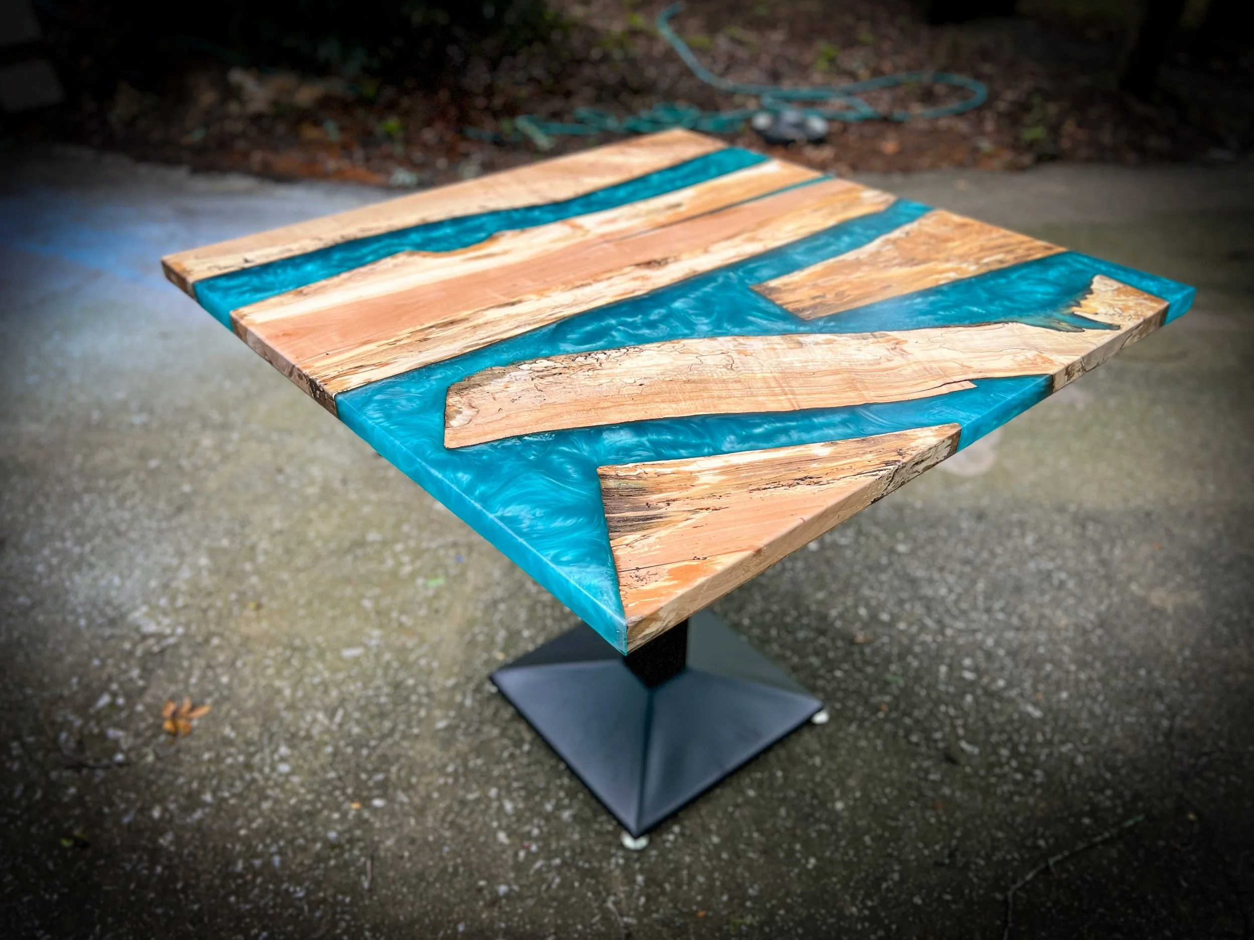 Spalted Maple River Table: Blue-Green Epoxy Resin, Black Metal Pedestal